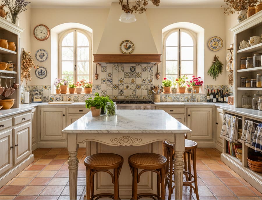 - Прованс — если вы любите уют и живописность. Пастельные тона, открытые полки с красивой посудой, ковка, камень, текстиль. Идеально подходит для больших кухонь, где можно раскрыть потенциал этого стиля. На больших площадях прованс не выглядит скучным, потому что каждый уголок может рассказать историю.