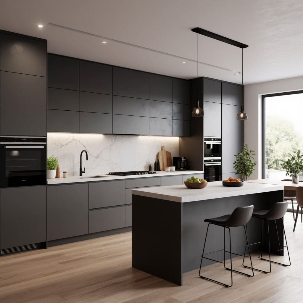 Фасады чаще всего делают из МДФ под покраску, пластика, шпона или крупноформатных плит. Всё это позволяет создавать ровные плоскости, использовать скрытые ручки-профили или механизмы, открывающиеся нажатием. Столешницы и фартуки всё чаще собирают из одного материала: камня, кварцита, агломерата, иногда — компакт‑ламината. Такая «монолитность» выглядит спокойно и визуально улучшает кухню, особенно если вы используете похожий по тону пол.