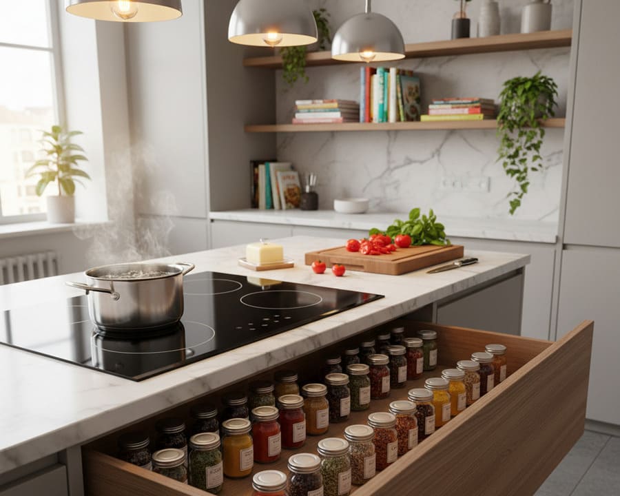 Современные системы хранения позволяют буквально выжать максимум из каждого уголка. В угловых тумбах вместо «мёртвых» зон ставят выкатные карусели или трапециевидные ящики, а в узких нишах прячут бутылочницы и системы для хранения противней. Минимальная ширина прохода в зоне рабочей кухни остаётся важной: при глубине столешницы около 60 см и стандартных корпусов напротив стоит шеренга шкафов или стол, поэтому полезно заранее проверить, достаточно ли остаётся пространства для комфортного выдвижения ящиков. Порядок в ящиках поддерживают с помощью разделителей, органайзеров и модульных контейнеров — это не столько декор, сколько ежедневное облегчение жизни.