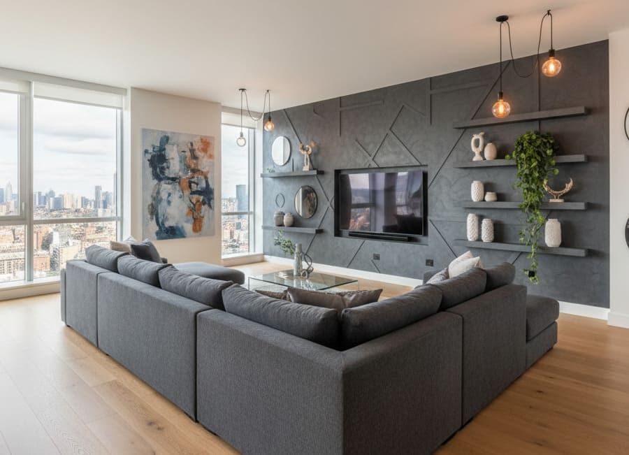 Запомните: дизайн стены в зале корректирует геометрию. Светлые стены с глянцем визуально расширяют площадь помещения 1–2 м², темные с точечным светом уютны вечером.