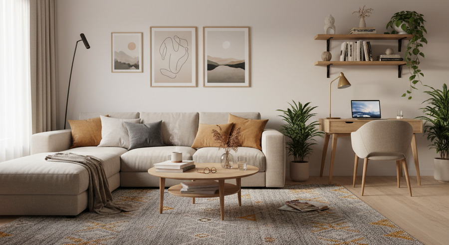 Цвет также работает на восприятие. Холодные тона визуально отдаляют объекты, тёплые — приближают. Это помогает создавать границы без конструктивных разделителей. Фактуры — третий инструмент. Матовый текстиль, дерево, камень — всё вместе они придают глубину и теплоту.